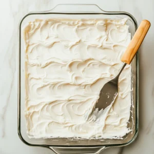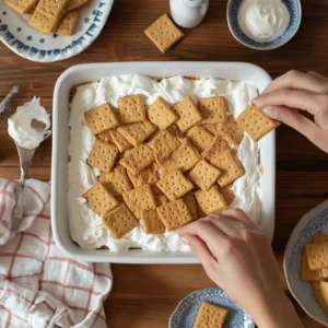 Spread a thin layer of whipped cream on the bottom of your 9×13-inch baking dish. This will help anchor the first layer of graham crackers in place.